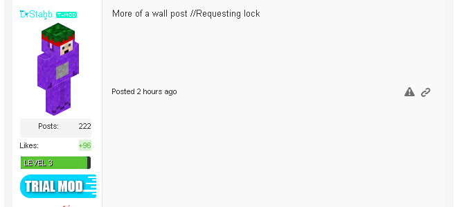 My interest here, in fact, was that my question was never answered. Here I go, trying to get from a reliable source some information on the server about staff members. Sorry for legitimately wanting to know who was promoted so I could potentially congratulate them for their accomplishment. I hate to stir up drama here, but was there really a point in locking the thread? I get that you're a moderator and all but come on. It was a simple question, not really a wall post at all, and the final point of it is, was my question answered ? Nope. If you take a quick peek at my wall, you'll realize how often people actually go on there and how the odds of people actually providing me with creditable information is at a pretty low rate. Someone please answer my question. I hate to make this unneeded post, but nobody answered my question.